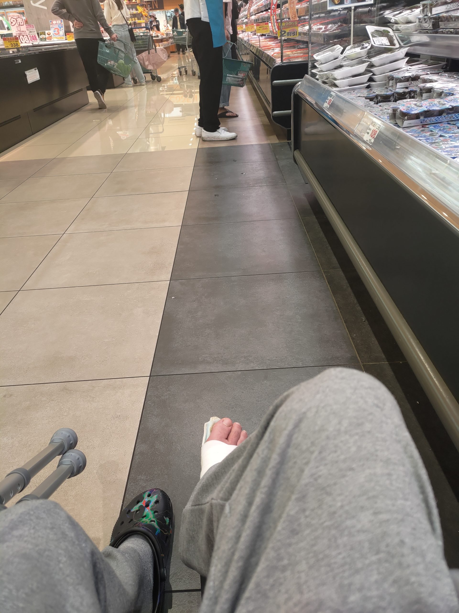 ただ、やっぱり車椅子だと視点がかなり低く、高い棚のものにも手が届かないので、車椅子があったとしても転倒せずに移動できるというわけで本格的な買い物をするには適していないかな、とも感じました。あと、患部のある右足は裸足状態なので、スーパーの店内にいると結構冷えます。スーパーは大きな冷蔵庫のようなものなので、靴や靴下の偉大さに気づかされる瞬間でもありました。