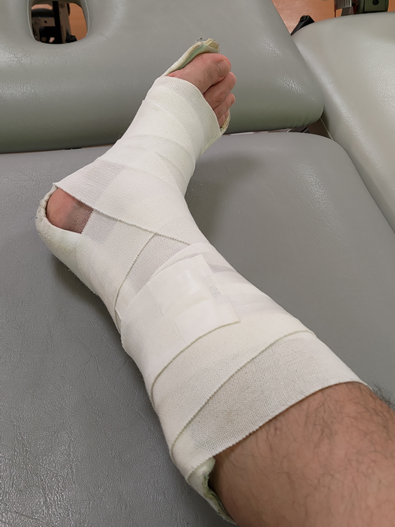 すでに傷口を保護するガーゼは外しているので、ギプスを包帯で巻いているだけですが、この姿とも今日でお別れです。だいたい1か月でギプスは外れるのが骨折治療の相場ですが、脛骨骨折は治りにくいのでもっと期間が長くなると思っていました。それもやはり超音波治療器が効いているものと思われます。