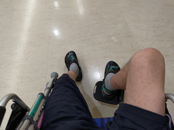 そこで、松葉杖を使って歩く訓練が始まりました。訓練と言ってもそれほど難しいものではなく、すぐに習得できます。あとはその歩き方でどれだけ歩くか。リハビリ師曰く「歩けば歩くほどいい」とのことで、この日から私は歩いて移動するようになり、それまでの1カ月半とは全く景色が変わりました。