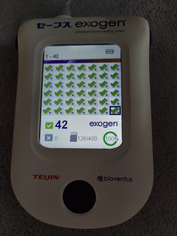 骨折の治療を速めるとして毎日使っている超音波治療器には、治療ログが表示されます。このログ画面が6週間で1画面なので、ちょうどこの日に1画面目がいっぱいになりました。これも感慨深い風景ですね。
